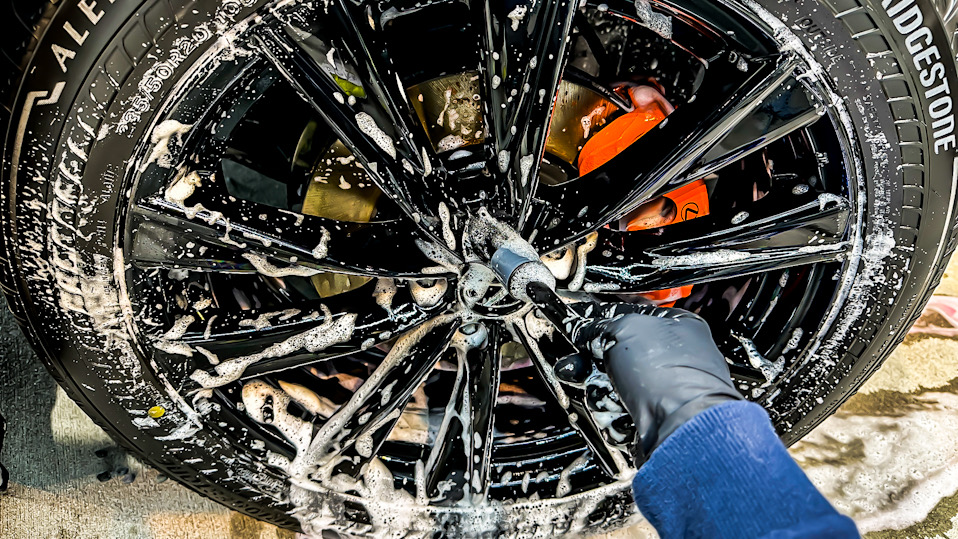まずは全体にアルカリ性洗剤で洗車をしていきます。